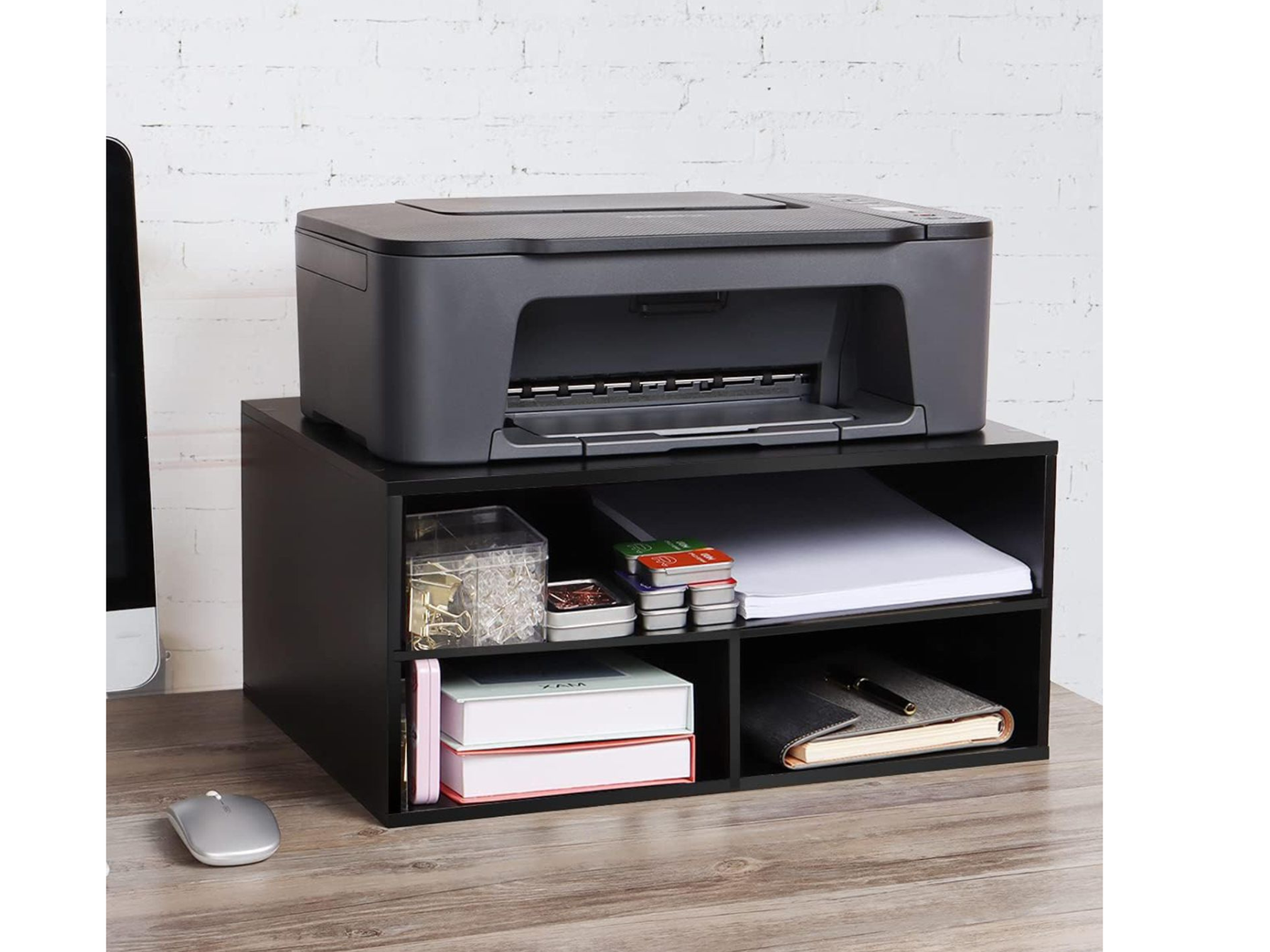 Home Sparkle 3-Tier Printer Stand with Storage – Wood Desk Organizer Shelf for Home/Office, Paper Tray, Printer Riser for Desk, Compact Monitor Stand