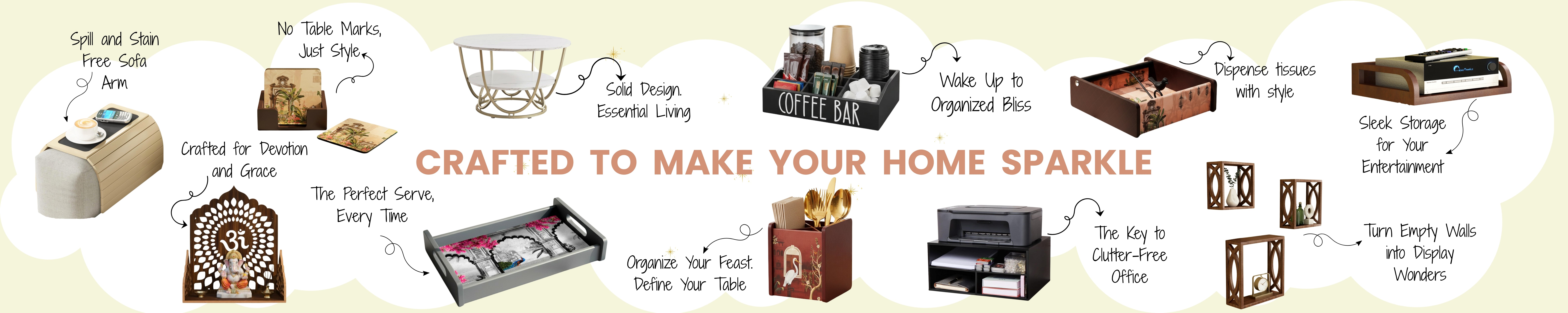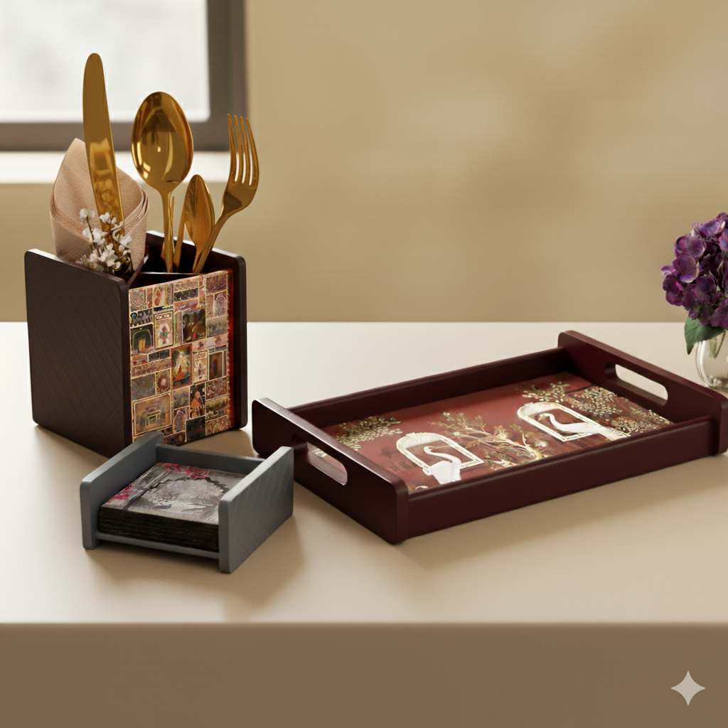 Our wide product range includes tableware items such as cutlery holders, trays, coasters, and sofa arm trays, along with a variety of home organizers, wall shelves, mandirs, and decorative accents. Each piece is made with care using high-quality materials like engineered wood and MDF, paired with trending prints and contemporary designs.