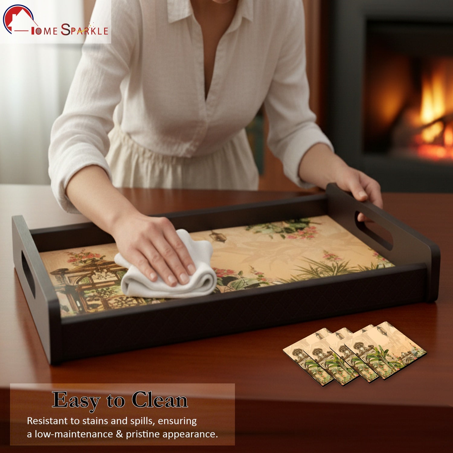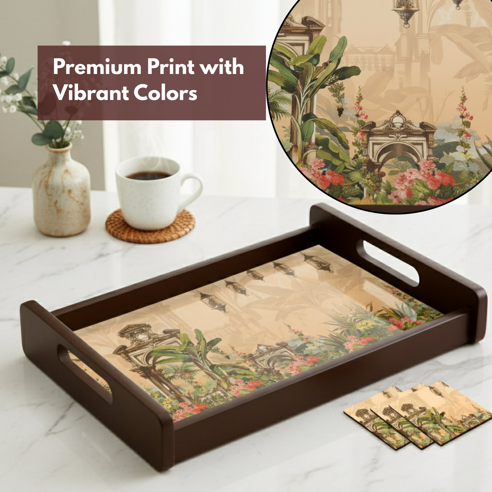 An artistic charm to your table with this Wooden Printed Tray, Crafted from durable wood, it features a beautiful Mughal-inspired floral design that brings elegance to your coffee breaks, breakfast in bed, or evening tea sessions. Comes with matching coasters for a coordinated and stylish look.