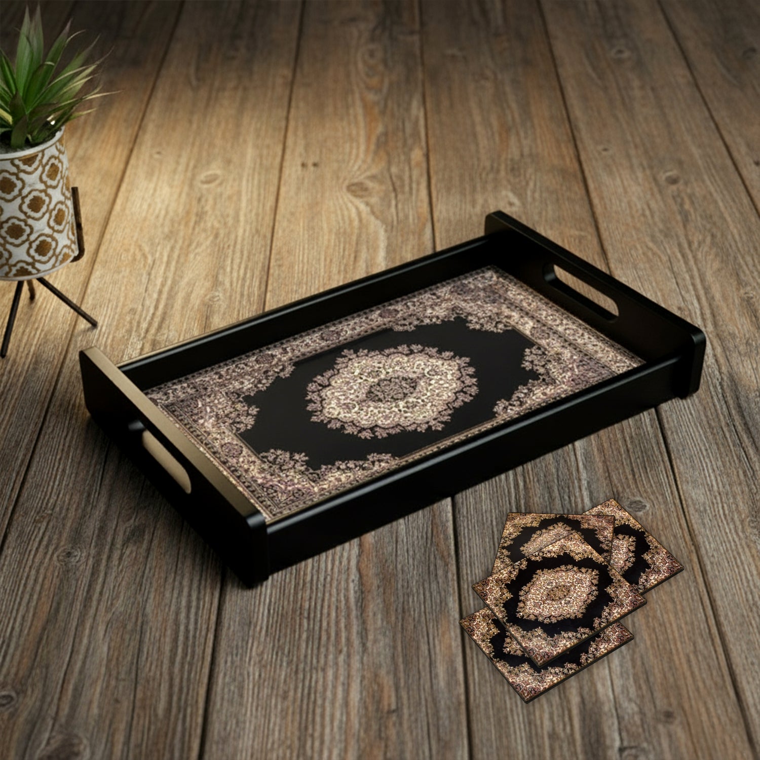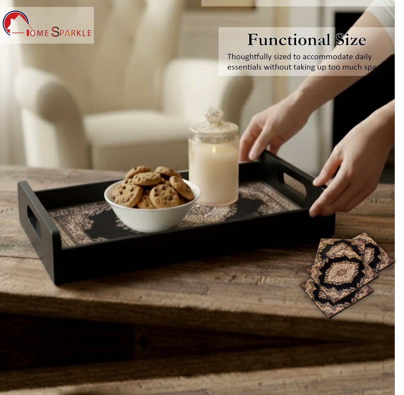 Enhance your serving experience with this beautifully Printed Wooden Serving Tray Set. Crafted from premium engineered wood, it features an elegant printed design that adds charm and sophistication to any space. Perfect for serving tea, coffee, or snacks, this tray comes with matching coasters for a coordinated and stylish presentation.