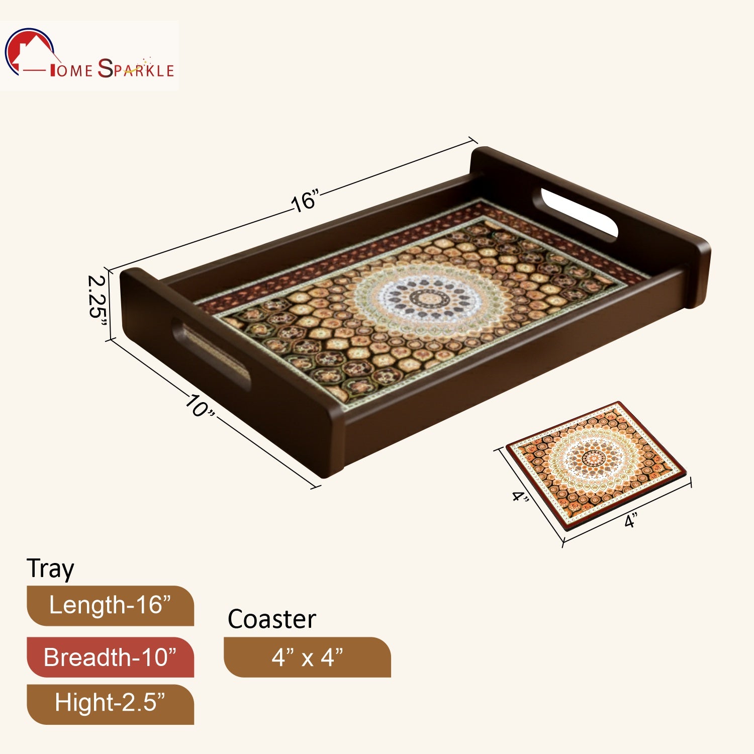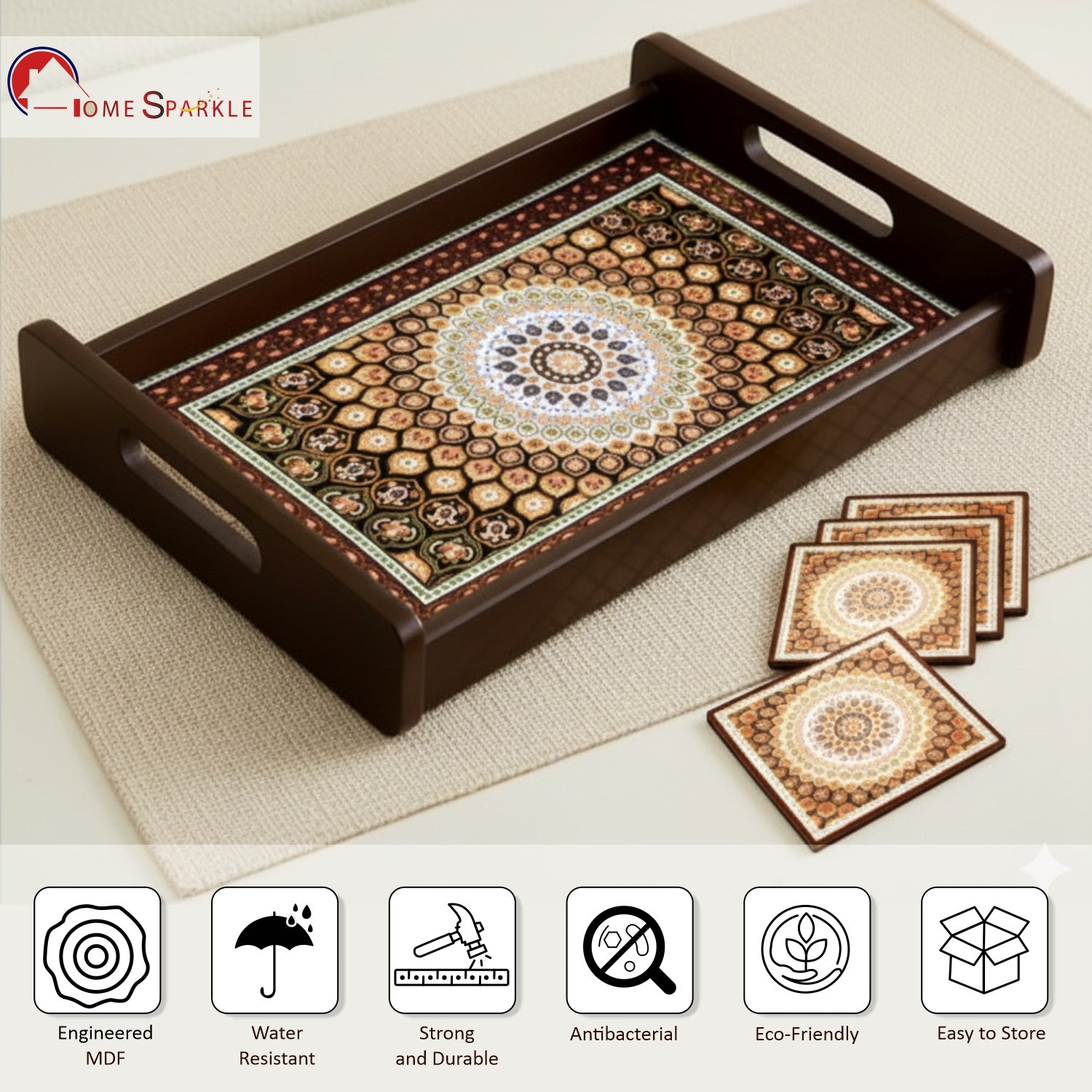 Enhance your serving experience with this beautifully Printed Wooden Serving Tray Set. Crafted from premium engineered wood, it features an elegant printed design that adds charm and sophistication to any space. Perfect for serving tea, coffee, or snacks, this tray comes with matching coasters for a coordinated and stylish presentation.